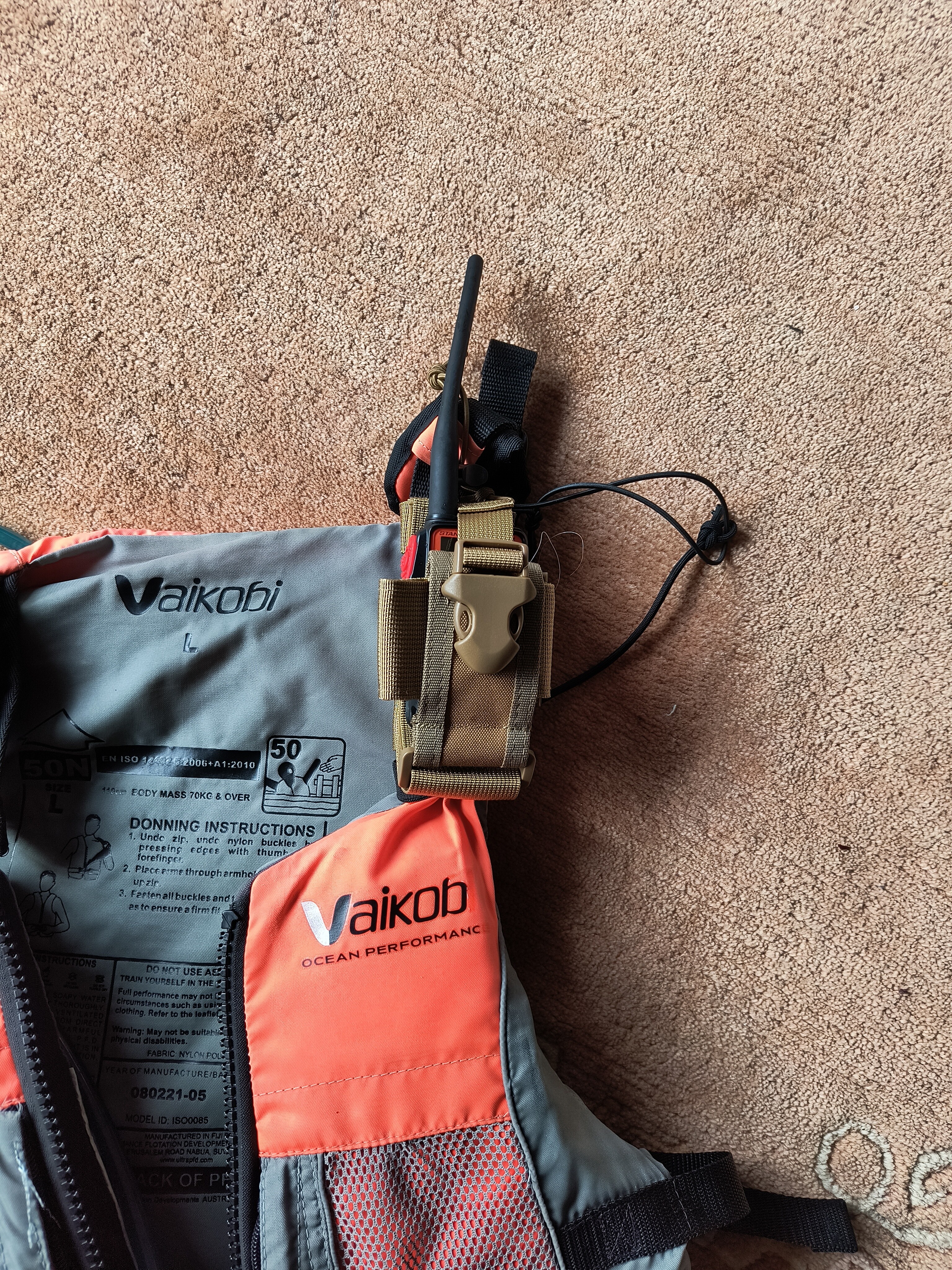 Well my 2 cents, for what it’s worth. I have a Vicobi PFD with large back pocket. Just open half the Velcro top area connect vhf radio to strong cord, place radio in rear pocked.. -after connecting cord to unit I also run it up side of antenna, then secure with short tube. Next run line over shoulder, through shoulder taps for straps and snap on to existing secure toggle with ss fisherman’s snap. It’s not going to break loose- Easily accessible pull cord up over shoulder. Secure does not interfere with any activity… Have call the Coasties a number of times and it works great. Spends most of its time resting in back pocket 🙂 D.