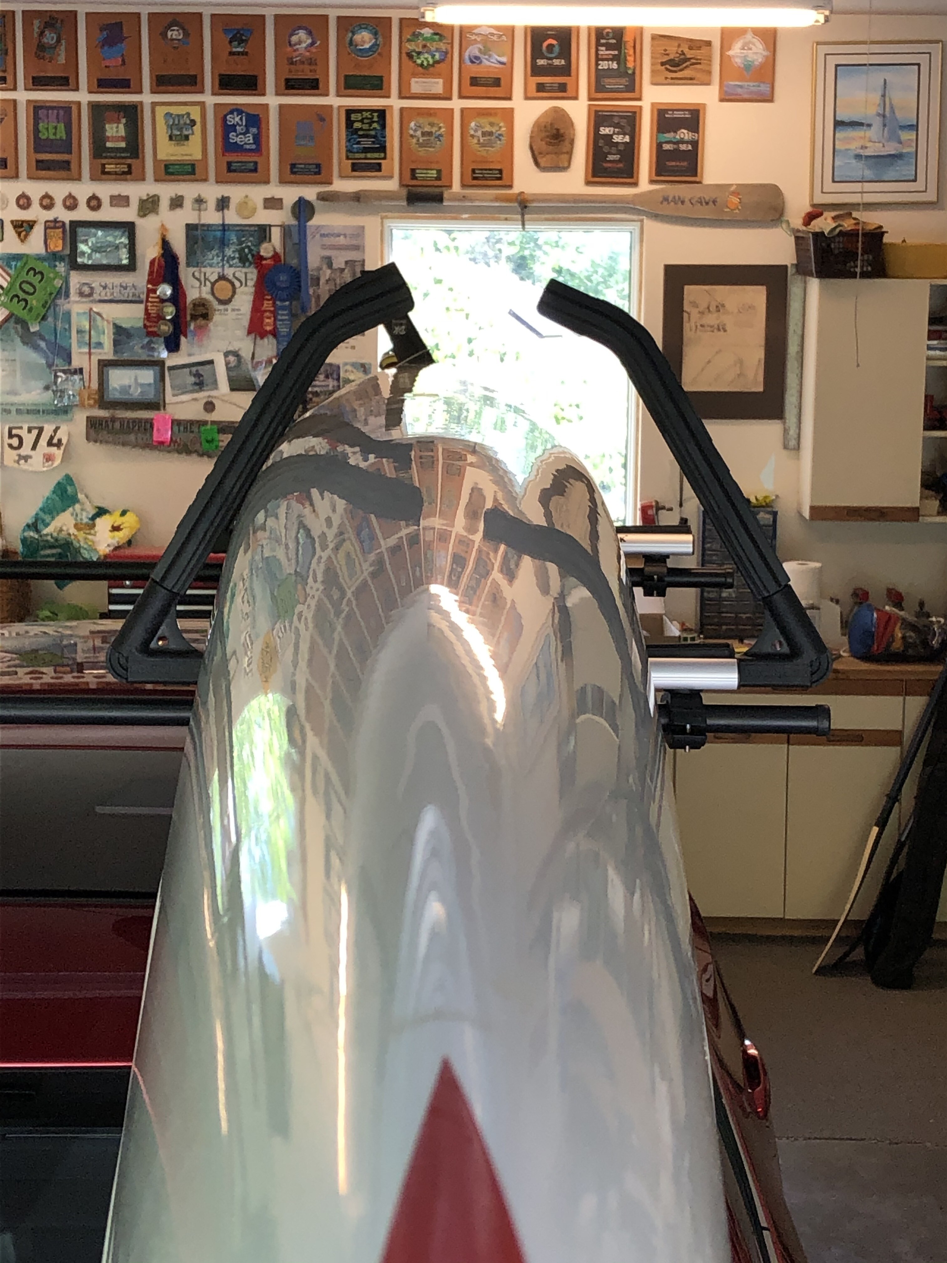 So after all the dialog last week, I decided to buy the Universal Lockrack from REI. …mostly I wanted to see it but wanted to be able to return it. So, after 2 hours for this mechanical engineer to figure out how to put it on the car (really not that complicated, but just that many pieces) I found that the arm is 3“ away from the Epic V-10L surfski! It would be 1” away from the phat V-9! Lockrack's Surfski version would still be an inch away from the V-10L. Also its only adjustable in 1“ increments. i.e. It only works for one boat and has to be re-adjusted to fit another one. Plus they don't have a phone number. They don't answer email. Neat idea, but the execution is one of the worst I've seen. picture is attached.
