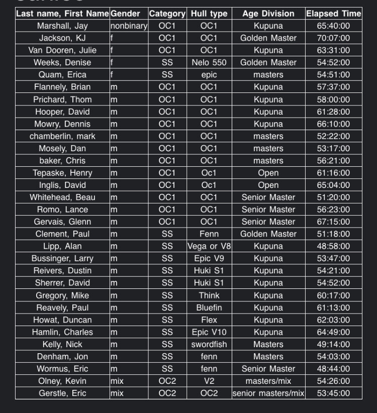 Paul, I believe thats you the OC-1 to surfski . Where do I pay the $100.00. And to really hurt me, you sprinted by at the end. Not my most glorious race,. Broke my toe last night carrying fire wood. (top that Sue) but the event was top notch. Although Peter could have made more waves. Flex Boy