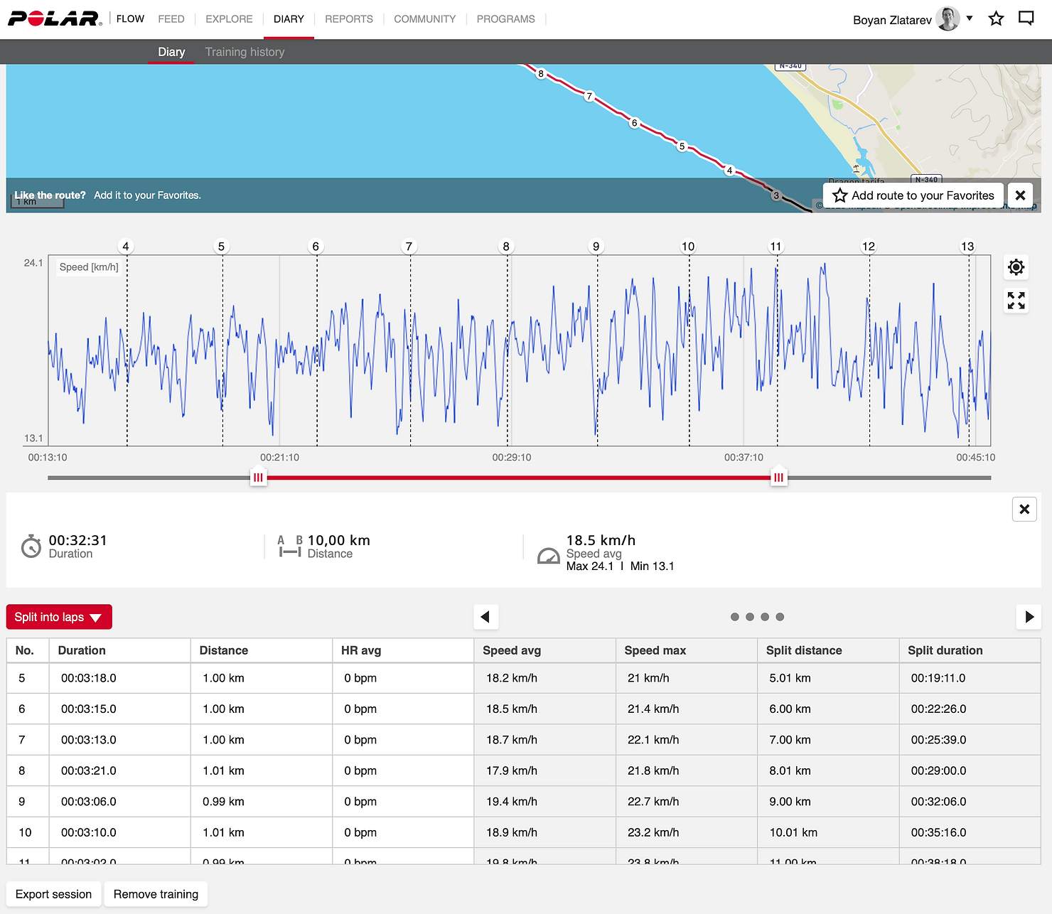 This is an excerpt of a downwind session from Tarifa to Bolonia. The overall paddling distance was 16.5 km for 58:18 min with average speed 17.0 kph. This image shows a fastest stretch of 10 km in the middle section where the average speed was 18.5 kph over 10 km distance or 32:31 min for 10 km paddling in a beginner level surfski.