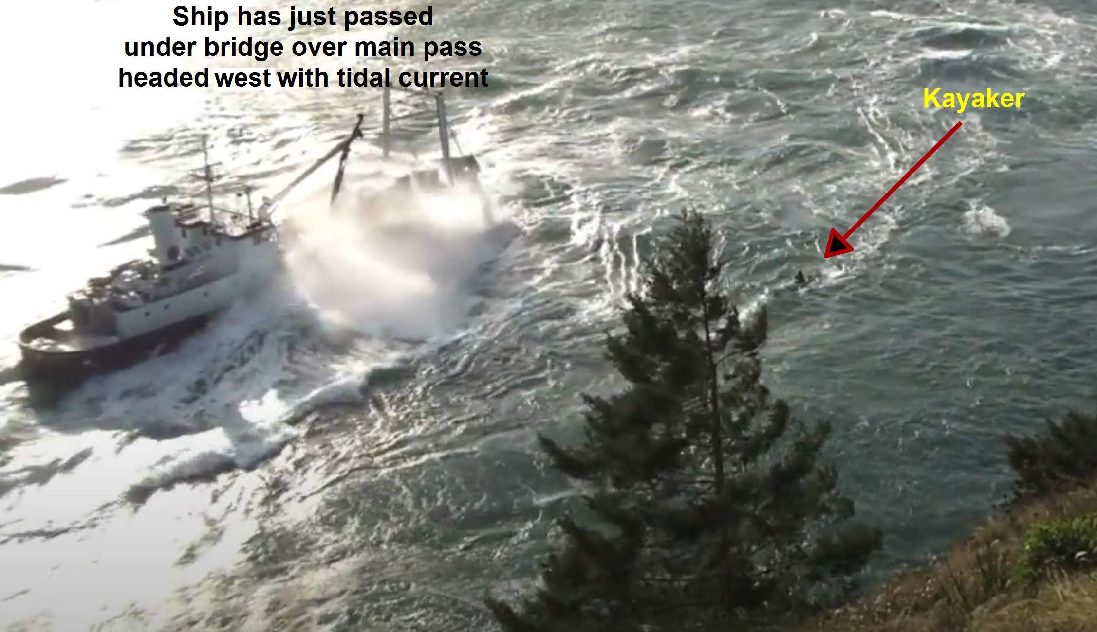 • Boats and Ships do travel through the Pass even when the tide current is strong and you should be alert for traffic. Boats traveling with the tide may be going through fairly fast and surfskis can be relatively hidden by the waves.