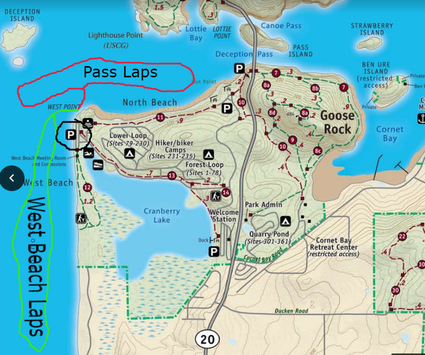 • Southside - normally launch from the West Beach parking lot in Deception Pass State Park. If the shore break gets too big you can launch from around the corner at the amphitheater parking lot. The Amphitheater and its parking are just to the east of West Beach - still on West Point. There is a sign on the road for the right turn to the Amphitheater immediately before you enter the West Beach parking lot. There is more grass for OC setup at the north end of the West Beach parking lot.