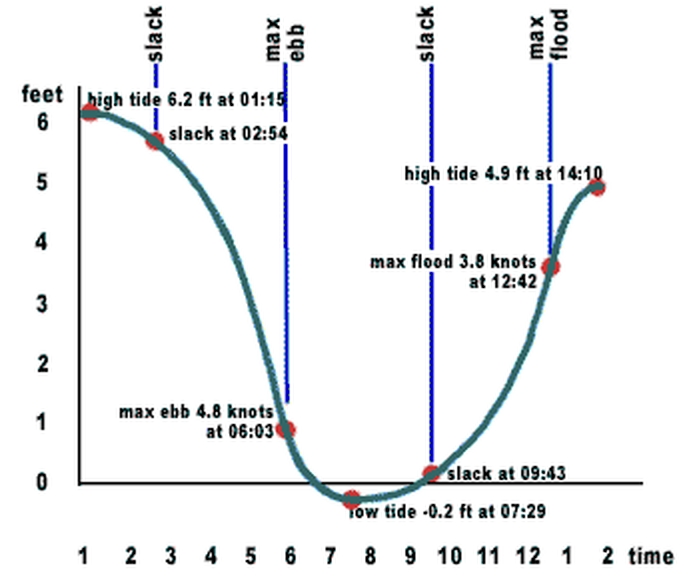 If you are planning a route, you will need a source of information about currents on your route as well as tides, because there can be many places where you cannot figure out current direction and strength based simply on local tide times. Slack Tide - The period in the tide cycle when there is little or no current. Slack water occurs approximately halfway between maximum ebb and maximum flood and can last for 15 to 45 minutes. Notice this is not the same as halfway between high tide and low tide - refer to the Bay Area tide chart below for a rough representation of the relationships between ebb, flood, slack, high and low water tides and their approx. 6 hr. intervals.