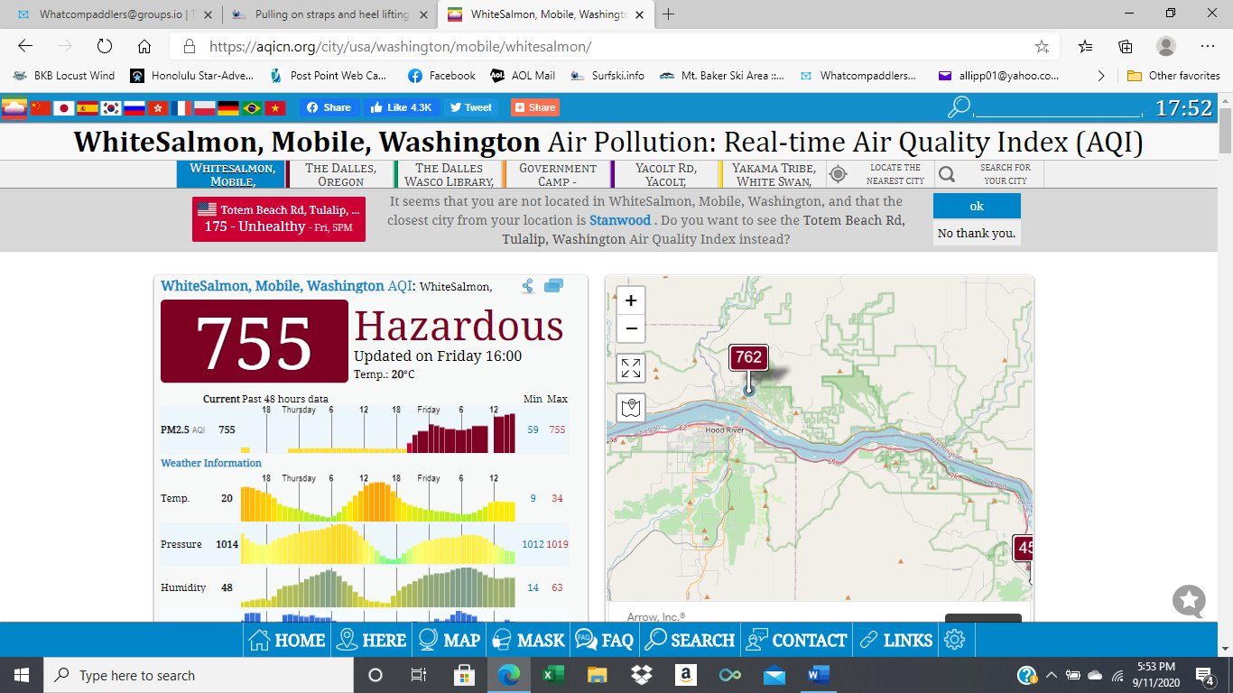 An AQI of 755? I must be using a different website-Wunderground shows a mere 596 here in White Salmon. However, when I drove over the Hood River bridge yesterday you could barely see the water below. No whitewater or downwinders for this guy again today